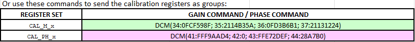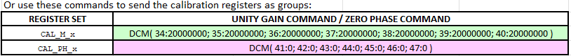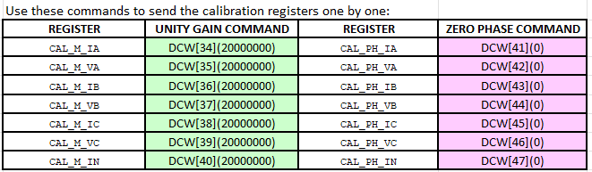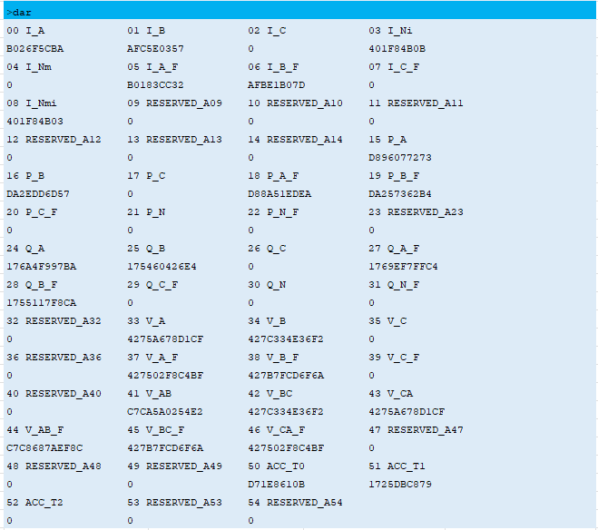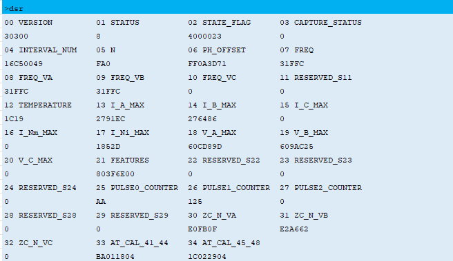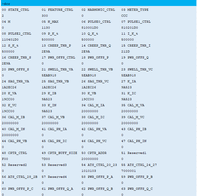 >DCR 00 STATE_CTRL 01 FEATURE_CTRL 02 HARMONIC_CTRL 03 METER_TYPE 2 700 0 CCC 04 M 05 N_MAX 06 PULSE0_CTRL 07 PULSE1_CTRL 0 1130 810601D0 810201D0 08 PULSE2_CTRL 09 P_K_t 10 Q_K_t 11 I_K_t 110401D0 500000 500000 500000 12 S_K_t 13 CREEP_THR_P 14 CREEP_THR_Q 15 CREEP_THR_I 500000 2E9A 2E9A 212D 16 CREEP_THR_S 17 PWR_OFFS_CTRL 18 PWR_OFFS_P 19 PWR_OFFS_Q 2E9A 0 0 0 20 PWR_OFFS_S 21 SWELL_THR_VA 22 SWELL_THR_VB 23 SWELL_THR_VC 0 5EAB918 5EAB918 5EAB918 24 SAG_THR_VA 25 SAG_THR_VB 26 SAG_THR_VC 27 K_IA 1A2EC26 1A2EC26 1A2EC26 4D291 28 K_VA 29 K_IB 30 K_VB 31 K_IC 19CC00 4D291 19CC00 4D291 32 K_VC 33 K_IN 34 CAL_M_IA 35 CAL_M_VA 19CC00 4D291 FCF598F 2114B35A 36 CAL_M_IB 37 CAL_M_VB 38 CAL_M_IC 39 CAL_M_VC FD3B6B1 21131224 20000000 20000000 40 CAL_M_IN 41 CAL_PH_IA 42 CAL_PH_VA 43 CAL_PH_IB 20000000 FFF9AAD4 0 FFE72DEF 44 CAL_PH_VB 45 CAL_PH_IC 46 CAL_PH_VC 47 CAL_PH_IN 28A7B0 0 0 0 48 CPTR_CTRL 49 CPTR_BUFF_SIZE 50 CPTR_ADDR 51 Reserved1 3F00 0 0 0 52 Reserved2 53 Reserved3 54 ATS_CTRL_20_23 55 ATS_CTRL_24_27 0 0 1010103 7010101 56 ATS_CTRL_28_2B 57 Reserved4 58 PWR_OFFS_P_A 59 PWR_OFFS_P_B 3 0 0 0 60 PWR_OFFS_P_C 61 PWR_OFFS_Q_A 62 PWR_OFFS_Q_B 63 PWR_OFFS_Q_C 0 0 0 0 > - Wait for about 2 seconds to let the DSP data to be stabilized.
