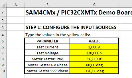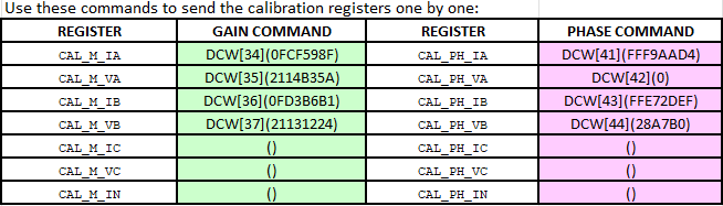 The calibration constants must be calculated according to the metrology library documentation. A spreadsheet is included in the distribution package to make the procedure easier. This spreadsheet calculates the proper values of the CAL_x registers and generates the commands to be sent to the board through the serial console to update the registers. This section explains how to calibrate the board using the spreadsheet. These are the steps to follow: