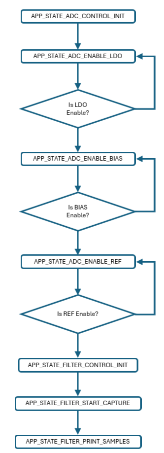 All samples are automatically captured in the data memory by DMA peripheral without any interaction with the user application. Once all samples are captured, interrupt is triggered and, data samples are sent to the terminal console application for analysis with an external tool.