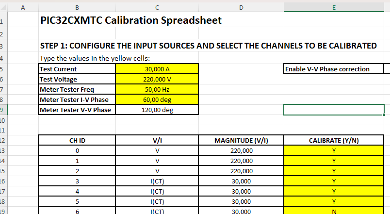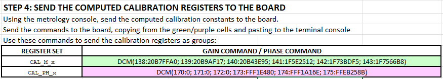 The calibration constants must be calculated according to the metrology library documentation. A spreadsheet is included in the distribution package to make the procedure easier. This spreadsheet calculates the proper values of the CAL_x registers and generates the commands to be sent to the board through the serial console to update the registers. This section explains how to calibrate the board using the spreadsheet. These are the steps to follow: