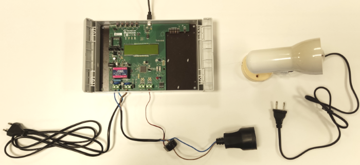 This chapter shows a simple example of use of the Demo Meter Application running on a real environment, measuring from a connected load. The setup is a light bulb connected to a PIC32CXMTSH-DB board through a Current Transformer, as depicted in the following image.