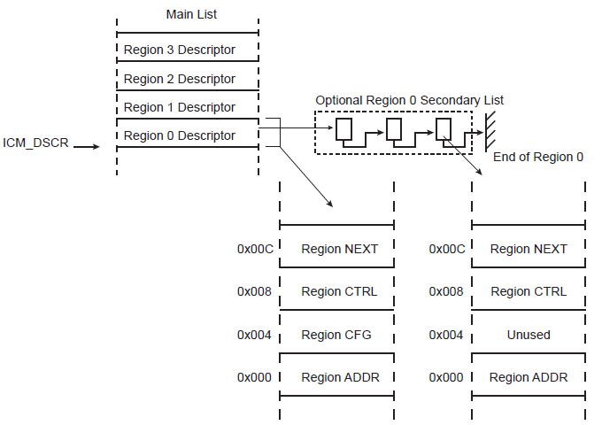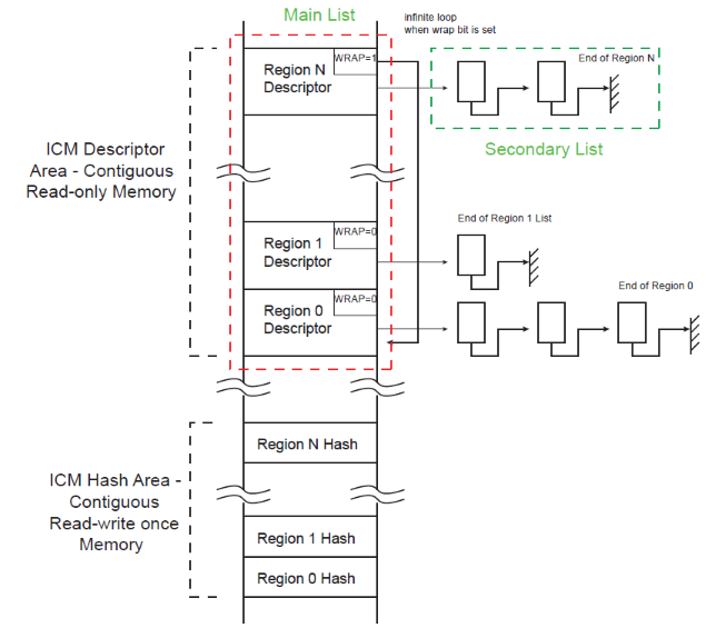 Each region descriptor supports gathering of data through the use of the Secondary List. Unlike the Main List, the Secondary List cannot modify the configuration attributes of the region. When the end of the Secondary List has been encountered, the ICM returns to the Main List. Memory integrity monitoring can be considered as a background service and the mandatory bandwidth shall be very limited. In order to limit the ICM memory bandwidth, use ICM_CFG.BBC to control the ICM memory load.