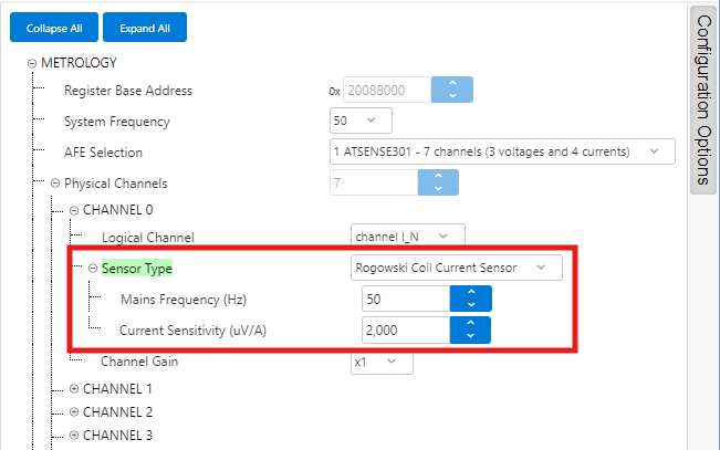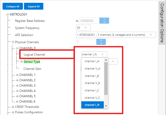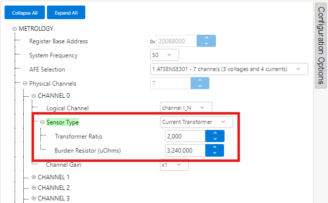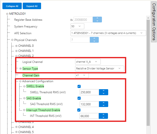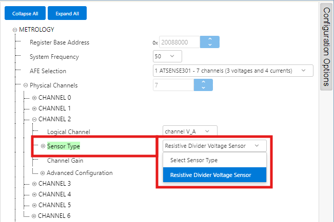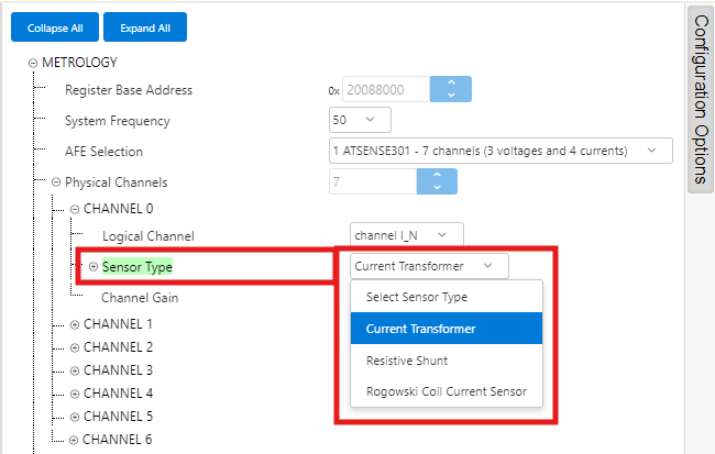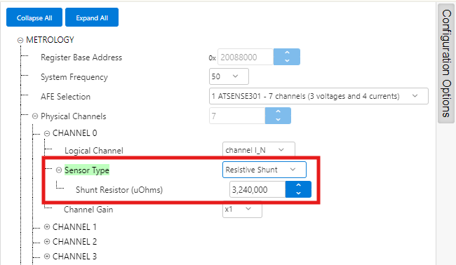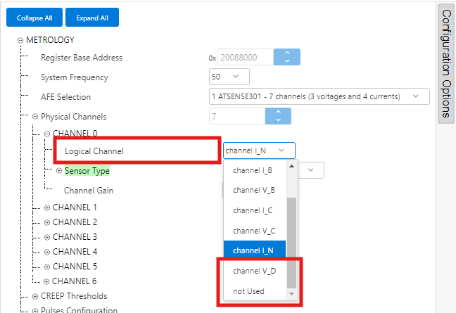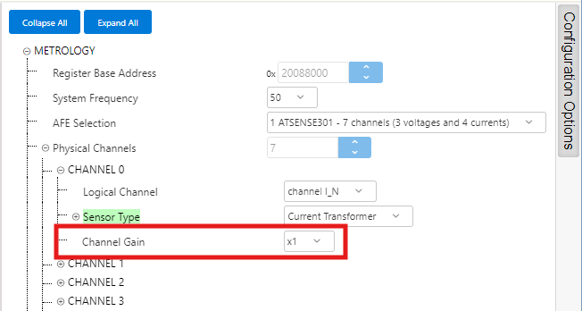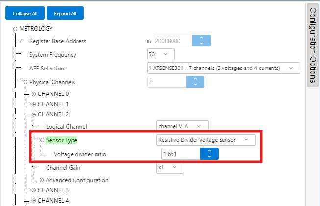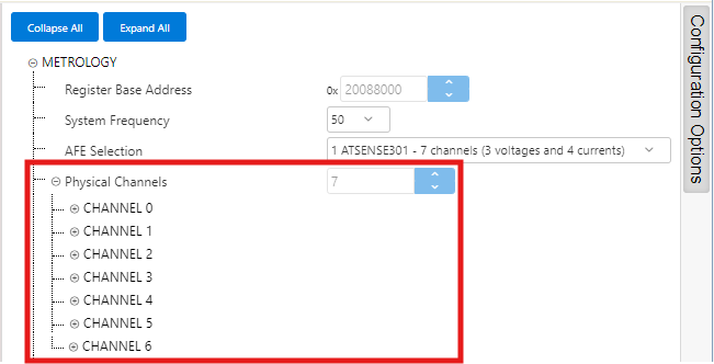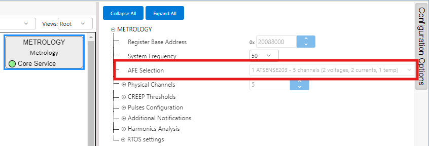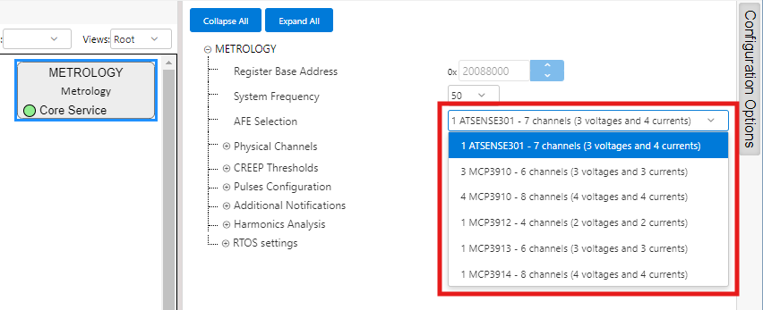 - ATSENSE301 is the default selection, as this is the AFE mounted in the PIC32CXMTC-DB. This selection provides 3 voltage channels and 4 current channels.