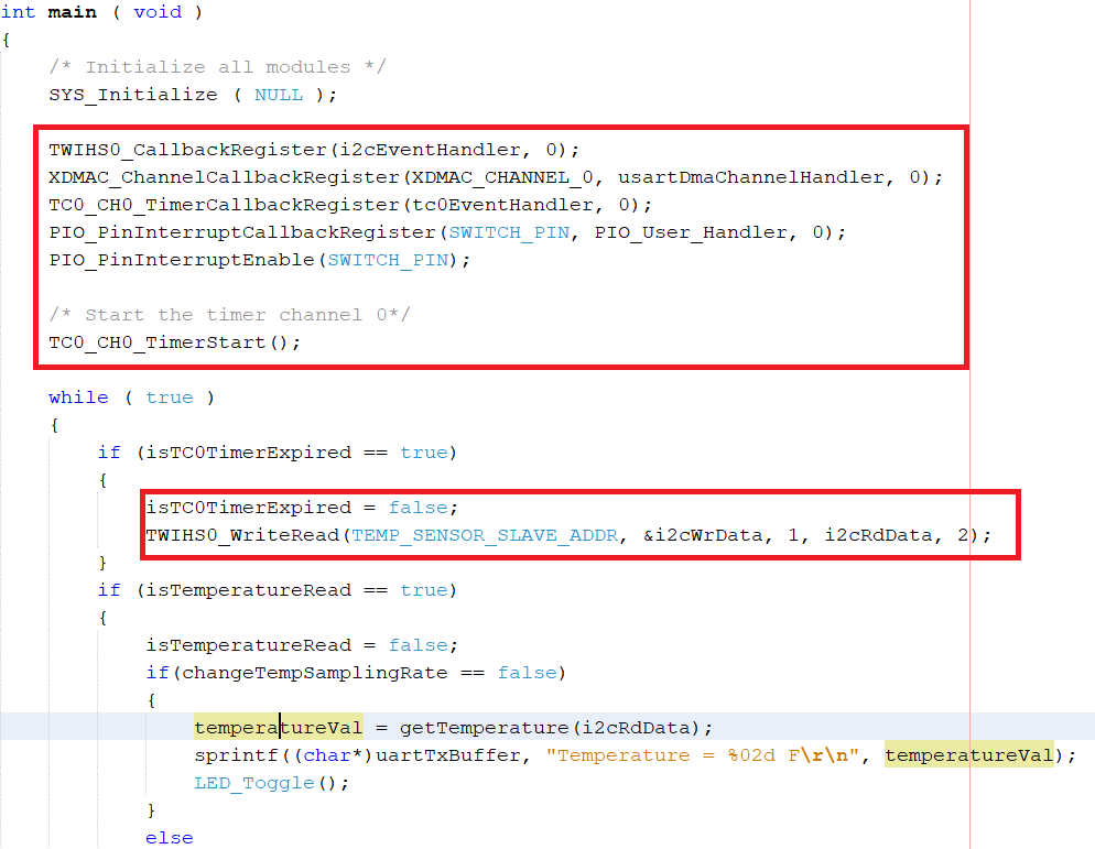 The following code shows callback function registrations for TWIHS, XDMAC, TC0, and PIO for getting started application on the SAM E70/S70/V70/V71.