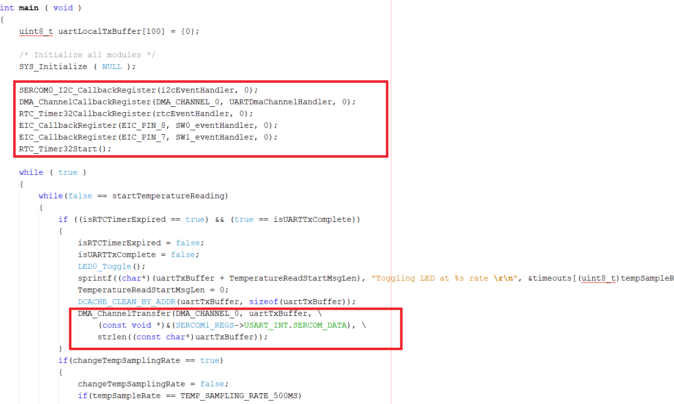 The following code shows callback function registrations for SERCOM, DMAC, RTC, and EIC for getting started application on the PIC32CZ CA80/CA9x.