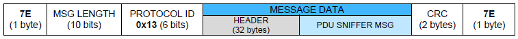 The following figures show the USI frame format of the sniffer frames. In this case, the field MESSAGE DATA that appears in the USI general frame format (See Figure 1-4) is divided into two fields: HEADER (32 bytes) and PDU SNIFFER MSG.