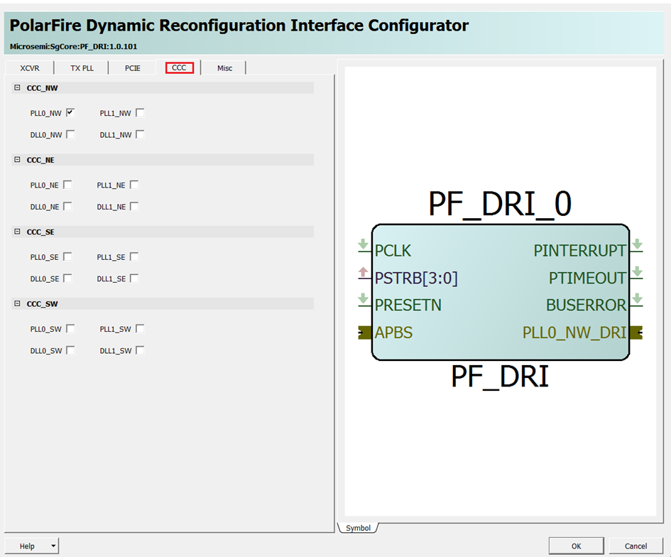 (Ask a Question)Each CCC has a dynamic reconfiguration interface (DRI), which can be enabled to configure CCC parameters without reprogramming the device. The CCC configuration is controlled by volatile configuration registers that are loaded with values from the flash configuration bits at power-up. An APB bus master must be interfaced to the CCC using a DRI macro for dynamic configuration. The APB bus master is used to dynamically modify the CCC configuration register values as per design needs. For more information on CCC configuration registers and their bit definitions, see PolarFire Device Register Map or PolarFire SoC Register Map.