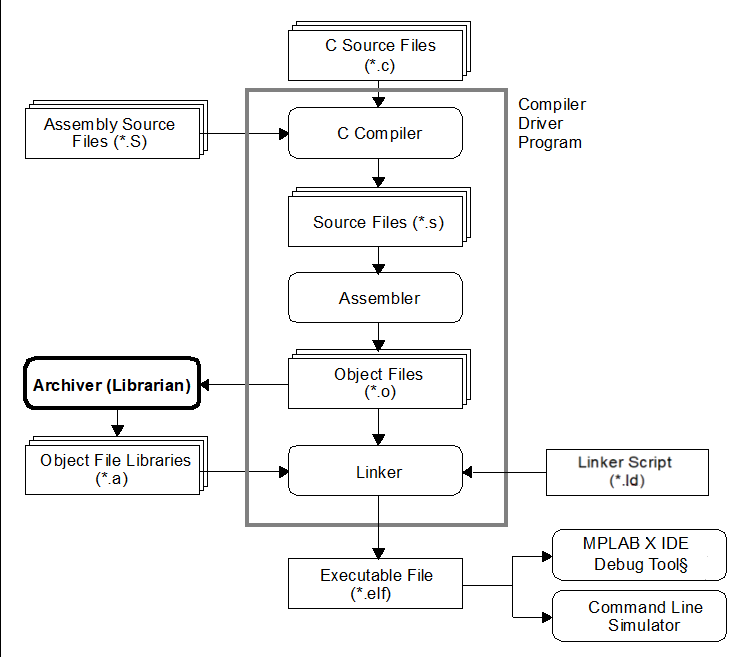 The 32-bit librarian creates an archive file from object files created by the 32-bit assembler. Archive files may then be linked by the 32-bit linker with other relocatable object files to create an executable file. See the figure below for an overview of the tools process flow.