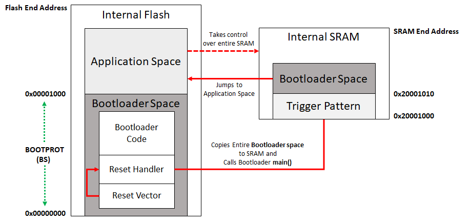 - Internal trigger: Bootloader will be triggered based on the trigger pattern written at a specific location in the SRAM by the application firmware.