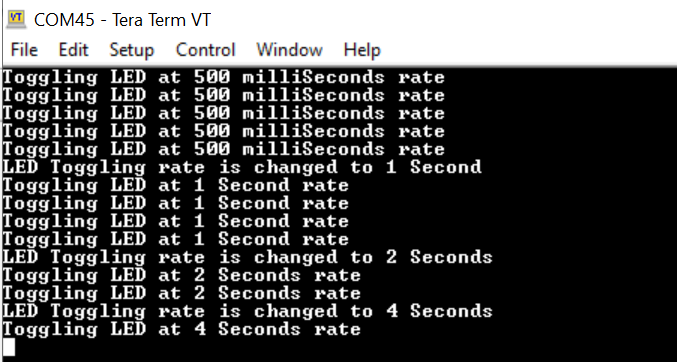 The Non-secure application requests the Secure mode application, reads the LED toggling rate and prints on the serial terminal. The LED toggling rate data is transferred to the Non-secure mode application when it requests to Secure application through Non-Secure Callables (NSC).
