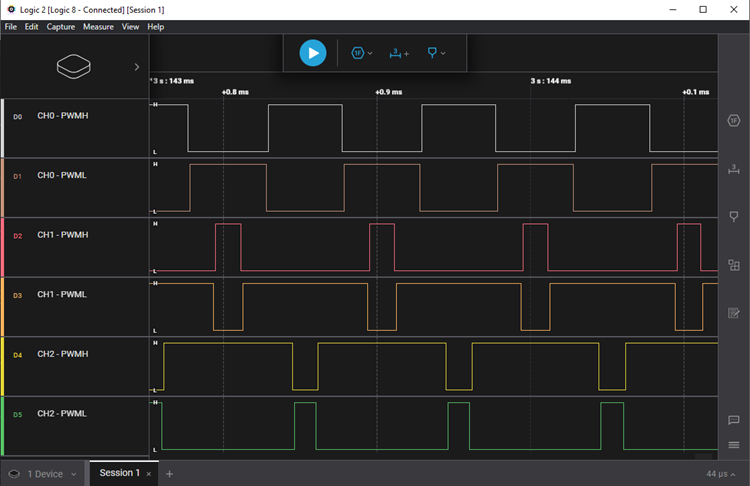 - The following high-side and low-side PWM waveforms are displayed on the Logic Analyzer