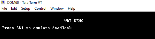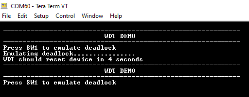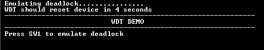 This example application demonstrates how the WDT peripheral library resets the watchdog timer by not feeding the watchdog on switch press. The application sets up the watchdog to reset the device. The application sets up the timer to blink an LED1 to emulate a process. A user switch press forces the device to wait in an infinite loop to emulate a deadlock. As a result a device reset is triggered as the watchdog counter overflows the bounded value.