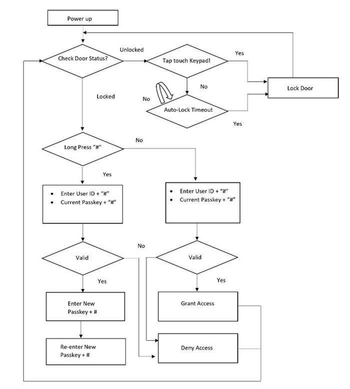 On powering the kit, the Smart Door Lock becomes functional and waits for the user input through the Touch Keypad to control the entry access. This kit allows up to five user-authenticated entries through the door lock, and each user has a user ID (1, 2, 3 , 4 and 5). Each user would require a passkey to enter through the Touch Keypad to open the lock.