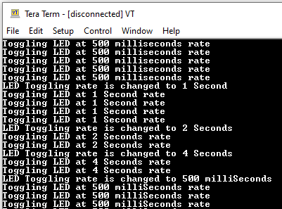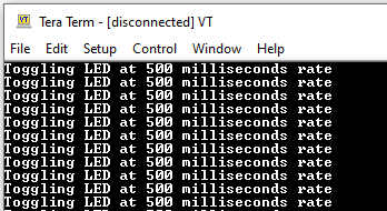 This application demonstrates an LED (LED0) toggle on a timeout basis and prints the LED toggling rate on the serial terminal. The periodicity of the timeout will change from 500 milliseconds to 1 second, 2 seconds, 4 seconds, and back to 500 milliseconds every time the user presses the switch SW0 on the PIC32CM MC00 Curiosity Nano evaluation kit.