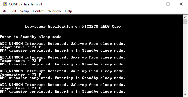The application demonstrates low power application on PIC32CM LE00 Curiosity Pro evaluation kit. On power-up, the device is set to Standby Sleep mode. The device wakes up from Standby mode and enters Active mode when the user covers the light sensor (for example, by placing a hand over it) on the I/O1 Xplained Pro Extension kit. The application periodically prints room temperature on a serial terminal while the light sensor is covered. The device goes back to Standby mode when the user uncovers the light sensor. LED0 on the PIC32CM LE00 Curiosity Pro evaluation kit is toggled every time the temperature is displayed on the serial console. When the user presses the switch SW1, the application switches Sleep mode from Standby mode to Idle mode.