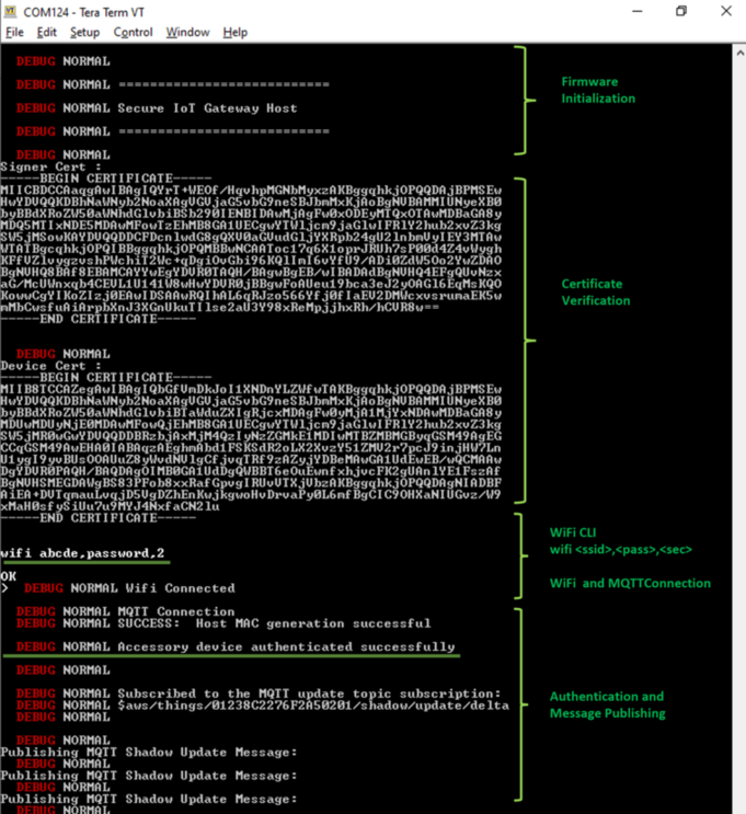 - The LED (LED1) will be on if there is no active Wi-Fi connection. Once the certificate verification is done, follow the steps in section Wi-Fi configuration through CLI to enter the Wi-Fi credentials.