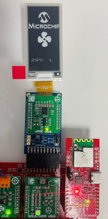 - The demo initializes working in Temperature Control mode. Based on the temperature measurement from Weather click, the fan speed will be controlled automatically. The LED1 on the Curiosity Nano is turned ON to indicate that the application is in Temperature Control mode.
