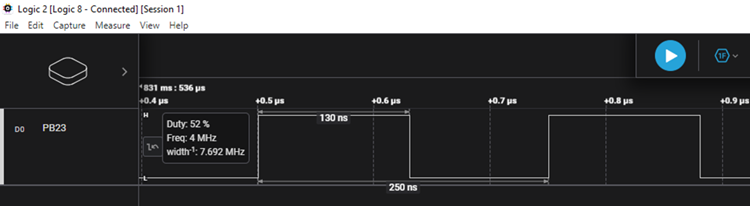 - Observe a clock of 4 MHz on the clock output pin PB23
