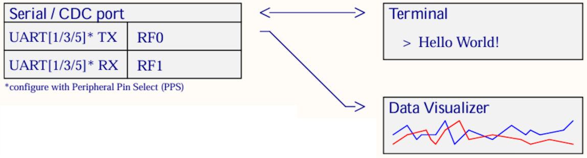 - It is possible to connect from the Serial/CDC port on the Curiosity Nano to either the Data Visualizer or a separate terminal program.