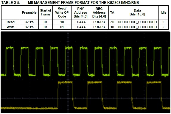 - Check the PHY Address: If no response is seen from the PHY, this issue could be the PHY address. Check the PHY address that the MAC is sending the request to, as well as the PHY address that the PHY is configured to (Table 2-2 in the KSZ8081RNB Datasheet).