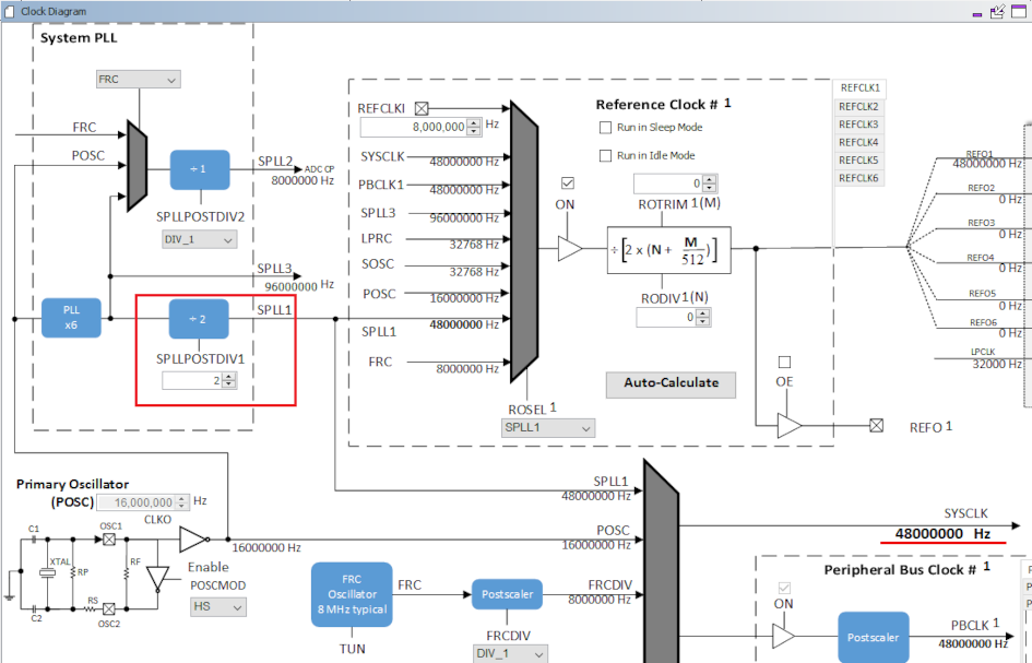 It is recommended to use 48MHz as SYS_CLOCK for better power savings. This can be configured by setting SPLLPOSTDIV1 to