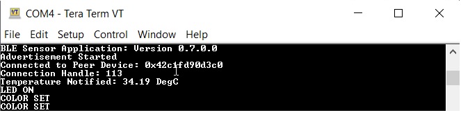 WBZ351 Curiosity Board starts in advertisement mode to advertise its presence on a smartphone and to allow access to LED on/off state and temperature sensor data.