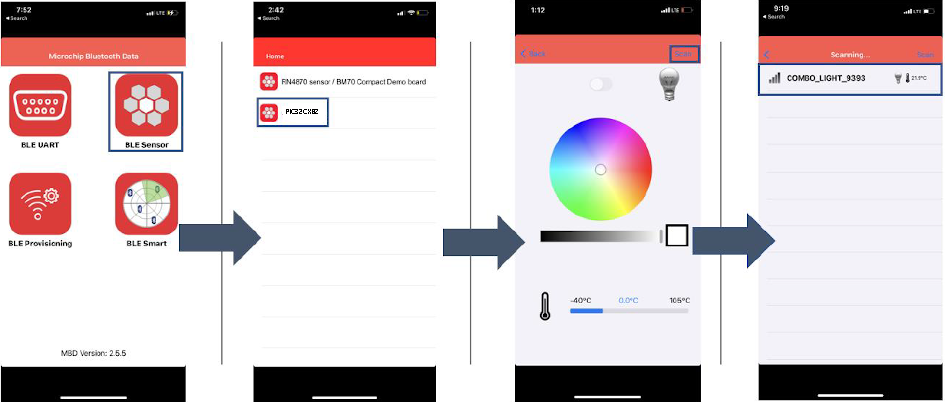 Uses “BLE Sensor” sub app from the Microchip Bluetooth Data (MBD) mobile app for BLE demonstration: