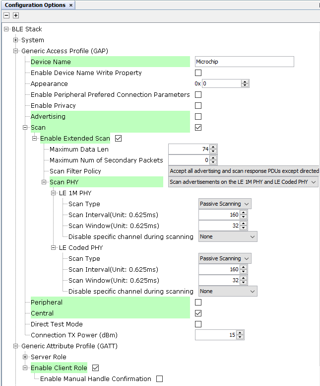 This document enables users create a central device and send/receive characters between two connected BLE devices over Microchip proprietary Transparent UART Profile. The central and peripheral devices using LE Coded Phy in this section are two WBZ351devices. The following instructions are applicable for a BLE Central device.