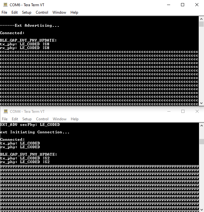 Users can now start sending data back and forth between the central and peripheral device using the terminal emulator. Characters entered on either terminals will immediately be sent to the peer devices