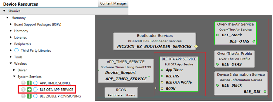 Click on "+" symbol "BLE OTA APP SERVICE" component from "Device Resources" of MCC to project