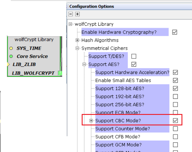 wolfCrypto Library component - AES-CBC mode is enabled.