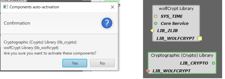 When the Image decryption option is enabled in the above step, the dependent crypto components will get added (if not already present in project graph). Accept Dependencies or satisfiers, select "Yes" in order to add the dependent components.