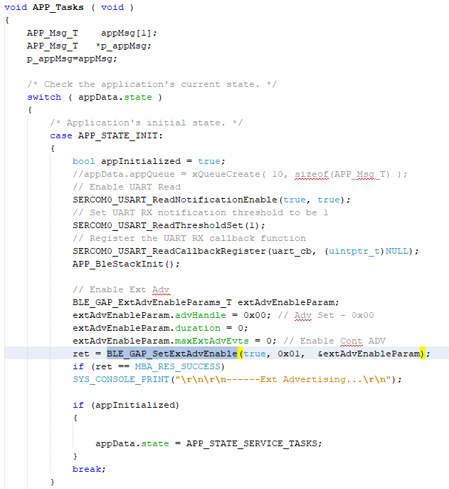 APP_BleStackInit()is the API that will be called inside the Applications Initial StateAPP_STATE_INITinapp.c