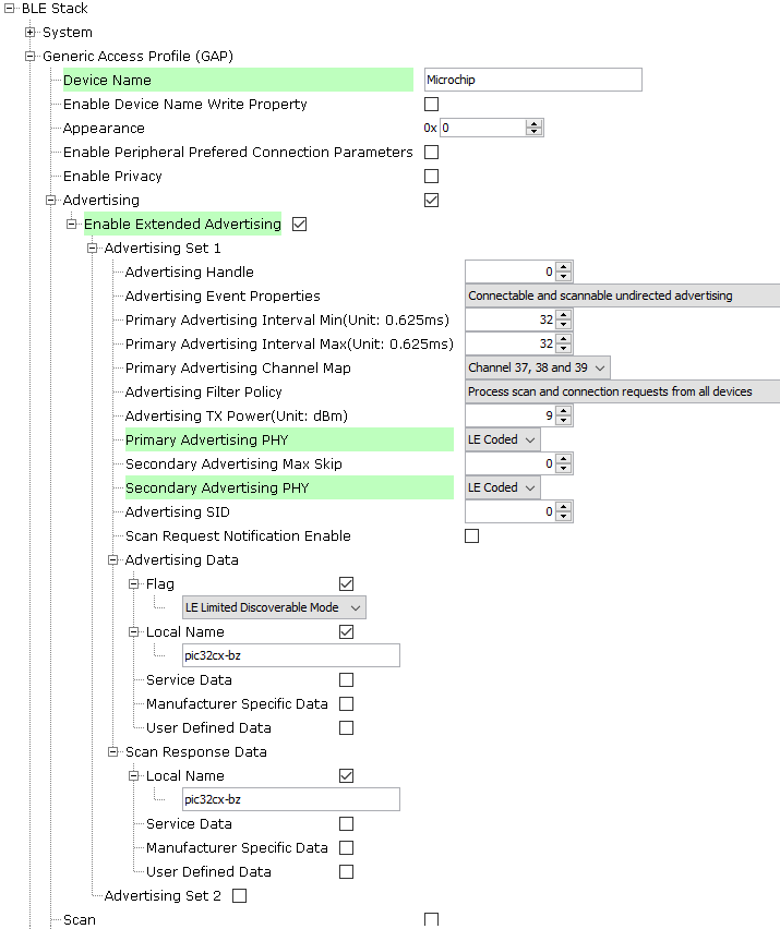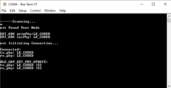 Upon programming the application, the WBZ351 Curiosity board will start Connectable Extended Advertisements with LE Coded PHY. Another WBZ351 board as a central device scanning for these advertisements will connect to the device. After a connection has been established, data can be sent back and forth over UART between the two devices. Demo will print “Ext Advertising…” indicating the start of advertisements on a terminal emulator like Tera Term. Application data to be sent to the connected central device must also be entered in the terminal emulator.