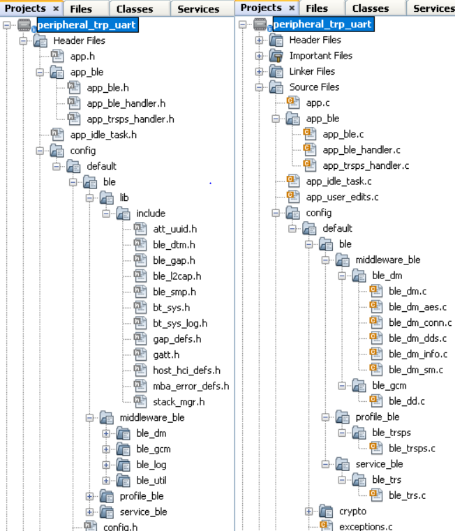 After generating the program source from the MCC interface by clicking Generate Code, the BLE configuration source and header files can then be found in the following project directories.