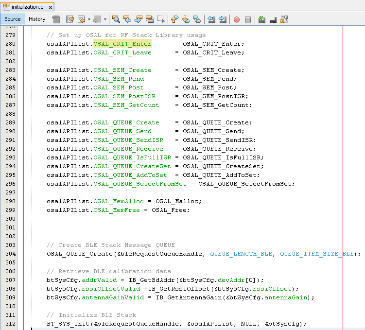 Initialization routines for OSAL, RF System, and BLE System are auto-generated by the MCC. See OSAL Libraries Help in Reference Documentation from Related Links. Initialization routine executed during program initialization can be found in the project file.