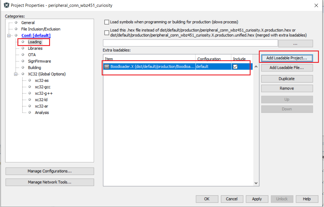 Bootloader - Standalone Bootloader project is available in \bootloader folder of application GIT repo. The bootloader code stays in Boot Flash section. The bootloader project can be added as loadable project into OTA project. When the OTA project is build, unified image with Bootloader+Metadata Header+Firmware will be generated. Add the loadable project/loadable file (bootloader.hex) into OTA project as shown below.