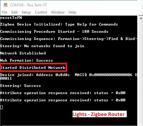Shows the success console output from a Dimmable Light Application which is a Zigbee router and establishes a Distributed Network.