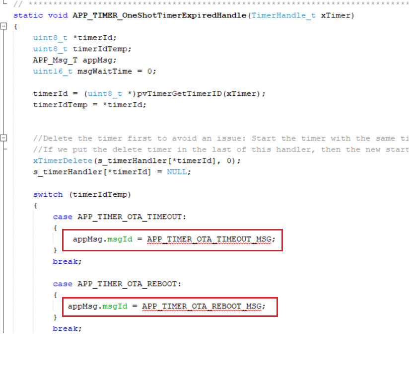 Uncomment timer message ID's in "app_timer/app_timer.c" needed for OTA error handling and reboot timer. When the timer is fired, the related message is posted in freeRTOS application task queue.