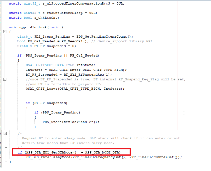 if (APP_OTA_HDL_GetOTAMode() != APP_OTA_MODE_OTA) BT_SYS_EnterSleepMode(RTC_Timer32FrequencyGet(), RTC_Timer32CounterGet());