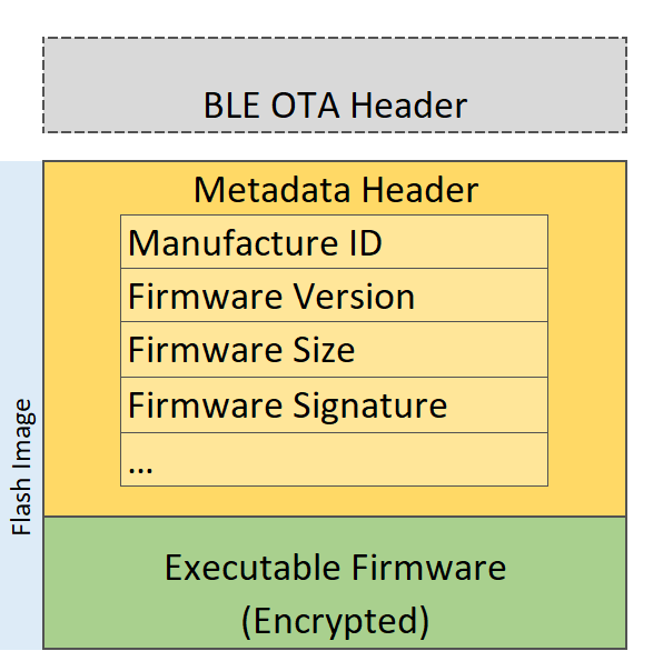 - Flash Image: Meta-data Header + Executable Firmware. This is full image content which is programmed in the device Flash Slot1.