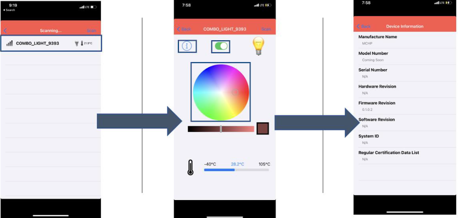The WBZ351 module will be a BLE peripheral device and will advertise on startup. The user can initiate the connection through mobile application. The advertisement payload holds the temperature information and the RGB On/Off status, for more information refer to Protocol Exchange from Related Links.