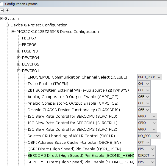 Note: To enable SERCOM0 hardware flow control on WBZ351 curiosity board using RTS and CTS, configure the TxD/RxD/RTS/RTS as below. At the same time keep "SERCOM0 Direct (High Speed) Pin Enable (SCOM0_HSEN)" of DEVCFG1 as PPS.-