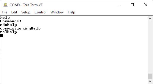 help | Commands: zdoHelp commissioningHelp zclHelp | Shows supported help sections. The console commands are categorized into three sections commissioningHelp, zdoHelp & zclHelp. |
