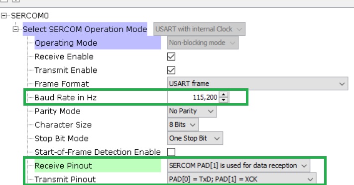 Configure the SERCOM0 component as shown in the below figure to set the uart baud rate, parity, data bits and Sercom Tx and Rx pins