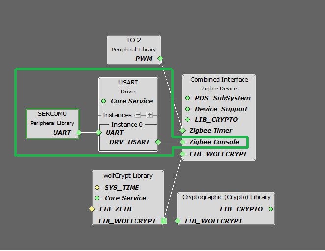 To enable the use of console, In MPLAB Code Configurator (MCC), Connect Zigbee console in the Zigbee device component to USART Driver Component and to SERCM0 component (for WBZ Curiosity Board) as illustrated below.