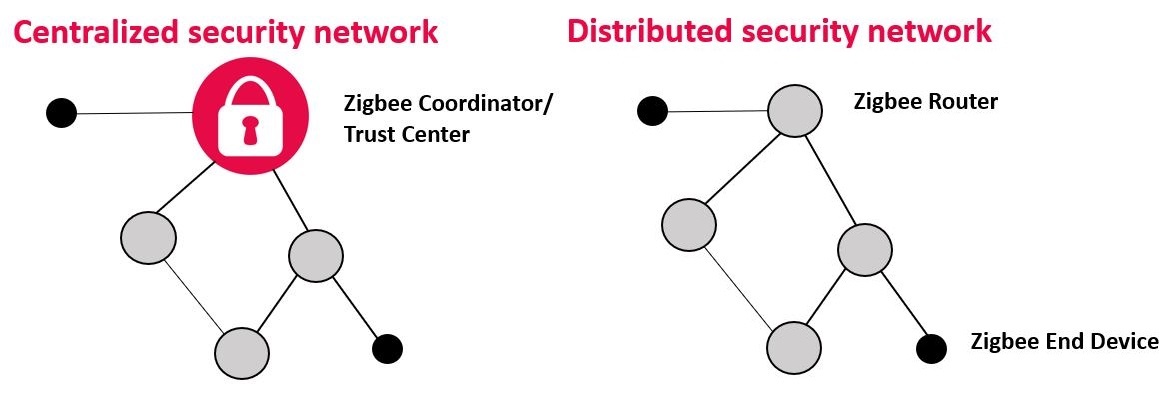 To satisfy a wide range of applications while maintaining low cost and power, Zigbee offers two network architectures and corresponding security models: distributed and centralized.