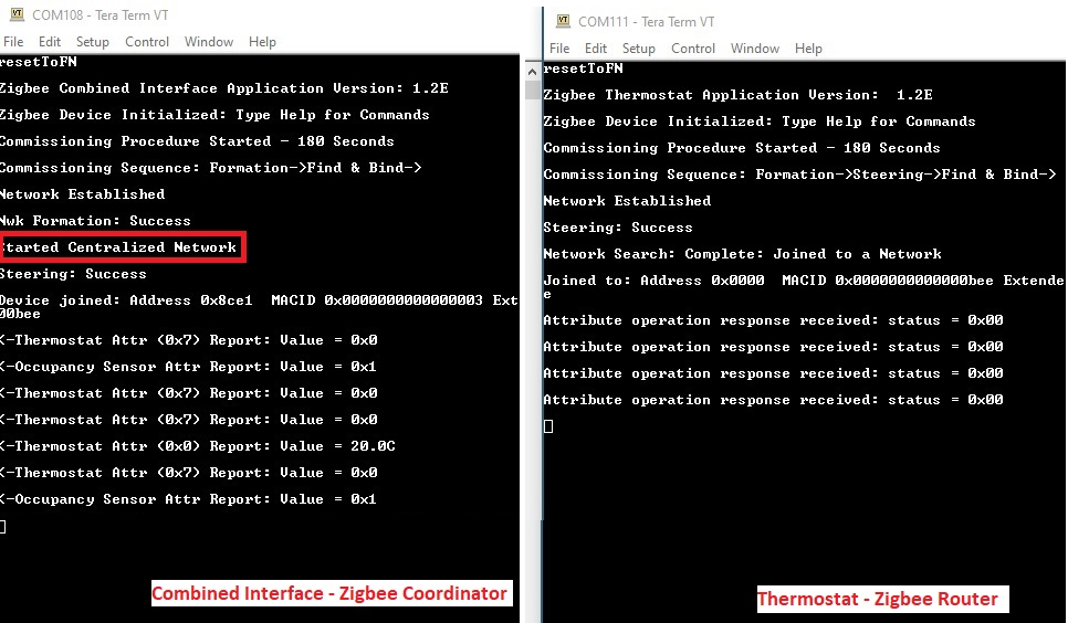 Let us realize the concept of centralized network with the help of Combined Interface device (Zigbee Coordinator) and Thermostat(Zigbee router). Once the coordinator is powered-on, it forms a centralized network. The router which is powered on later, will join the already existing network. Now, the router is capable of supporting other new end devices to join the network via association process etc.