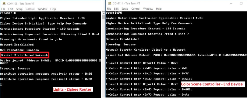 Shows the console output from a Extended Light Application (Zigbee router) establishes a Distributed Network. A Color Scene controller (Zigbee end device) joins the network :
