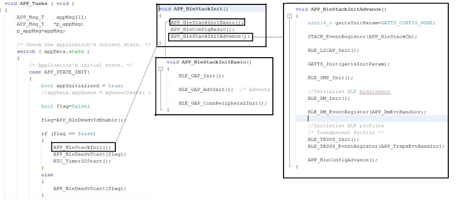APP_BleStackInit()and the Deep Sleep Advertising functionality inAPP_BleDsadvStart(flag) APP_BleStackInit()andAPP_BleDsadvStart(flag)are the APIs that will be called inside the Applications Initial StateAPP_STATE_INITinapp.c